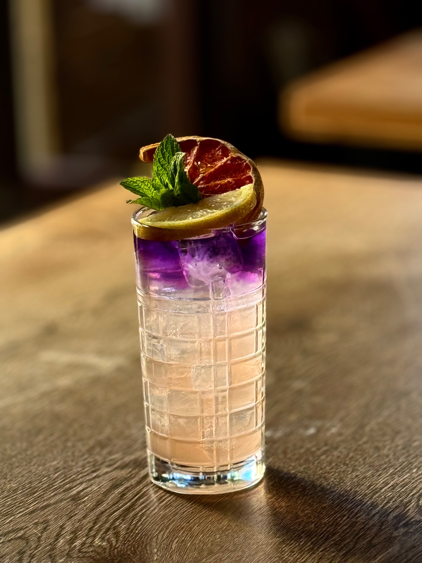 Gin 22, elderflower sirup, lime bitters, Bombay gin infused by Clitoria Ternatea, pink grapefruit lemonade