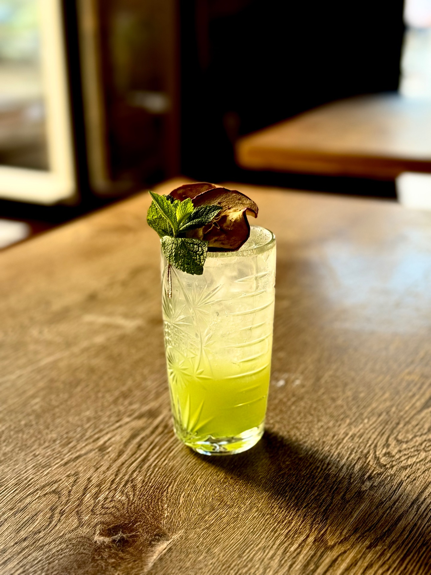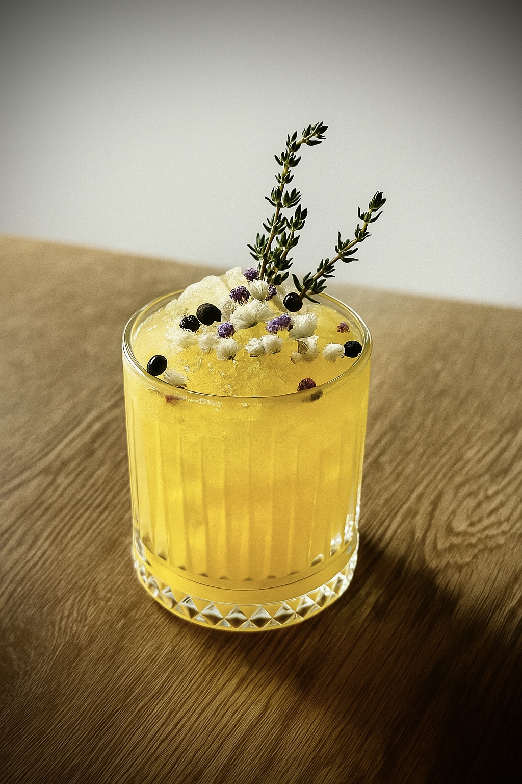 Yu gin, mango puree, lychee lemonade, lime, thyme, baby's breath flowers