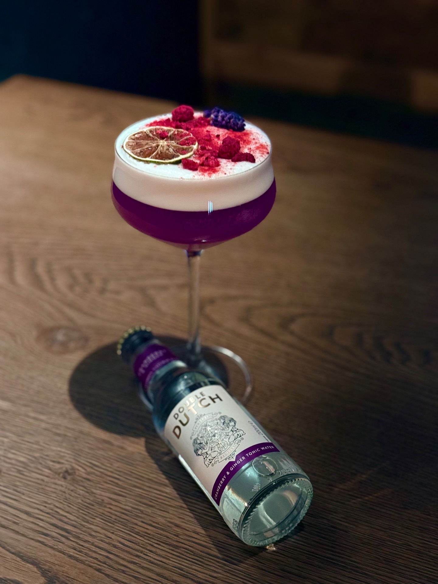Bombay gin infused by Clitoria Ternatea, Jodhpur gin infused by Hibiscus, almond sirup, lime fresh, simple sirup, eggwhites, cranberry tonic