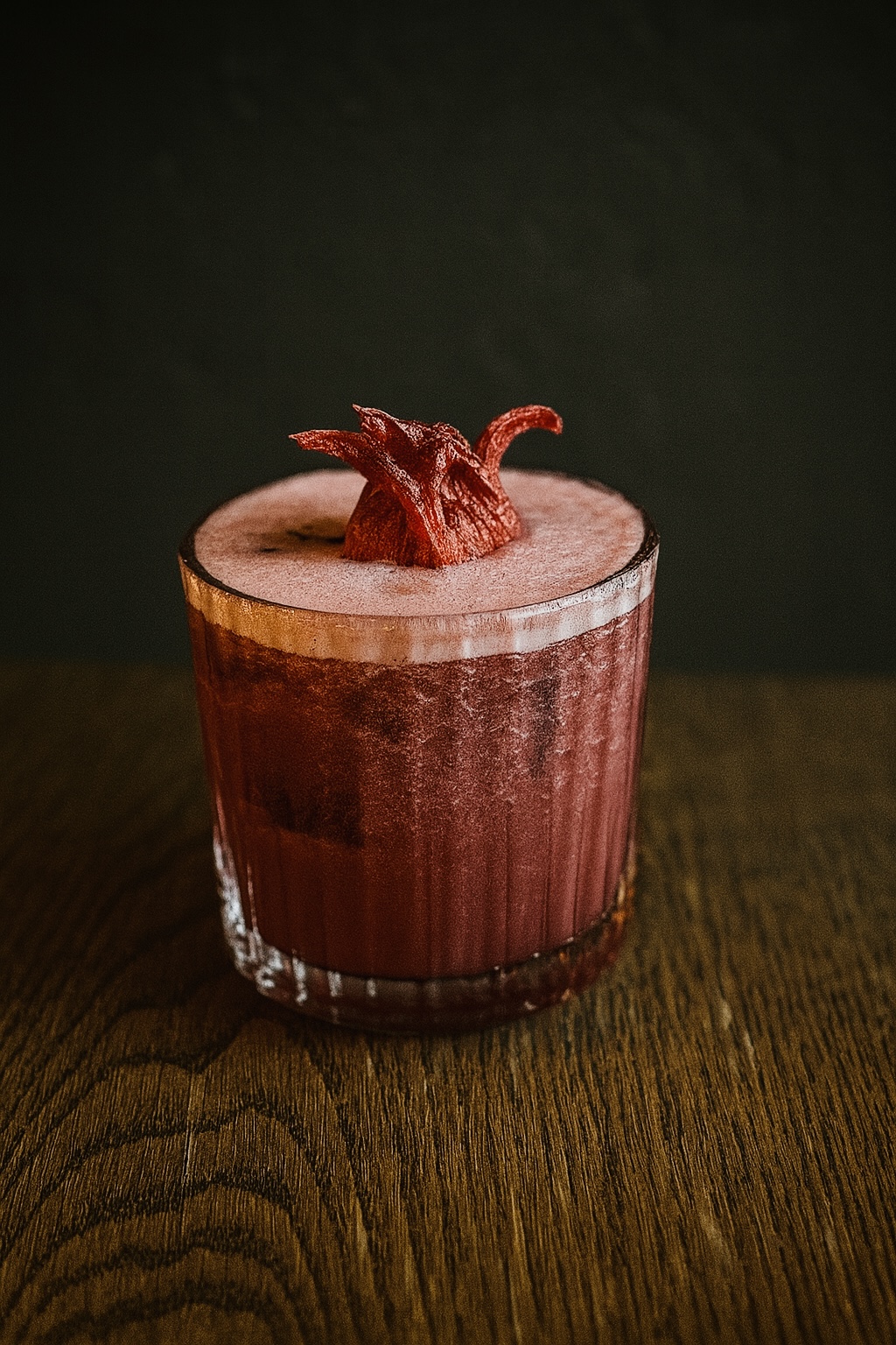 Mezcal, raspberry puree, lemon, almond, pineapple juice, tabasco